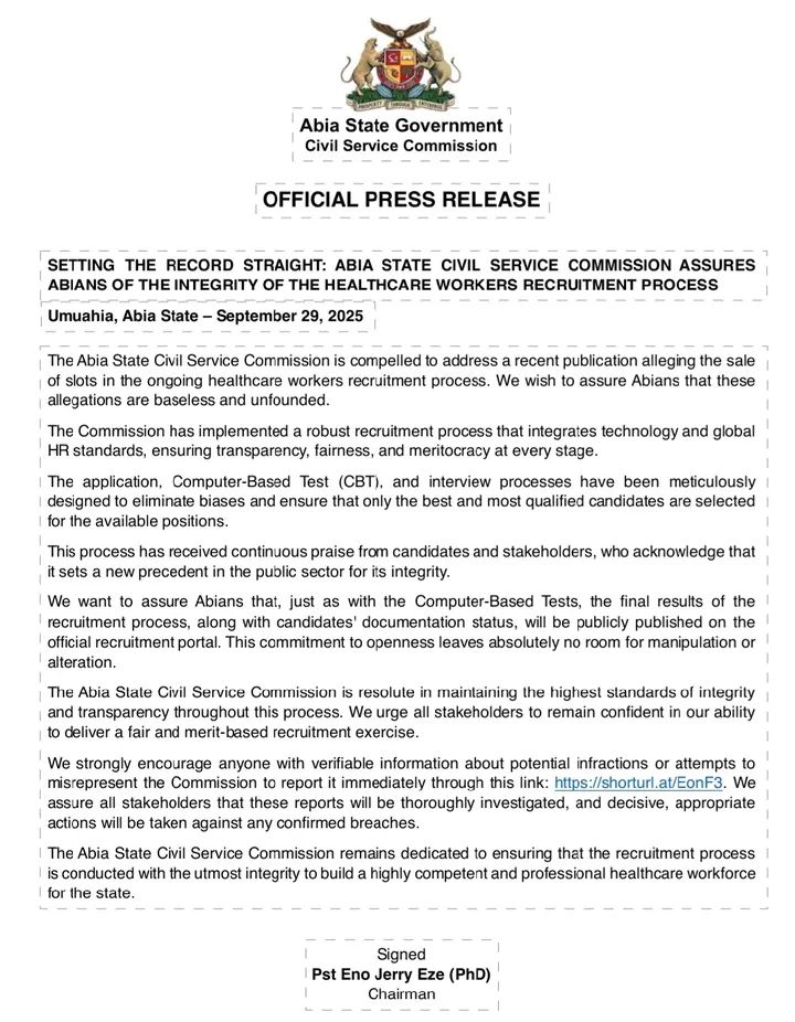 In a statement issued on Monday, September 29, 2025, in Umuahia, the Commission described the claims as baseless and unfounded. It emphasized that the recruitment process is anchored on global HR standards, integrating technology to eliminate bias and ensure only the most qualified candidates are selected.
