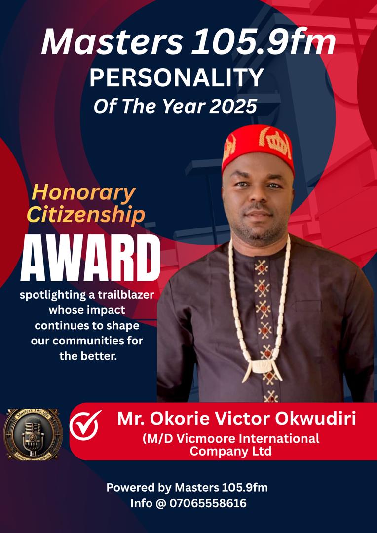 Mr Okoroie Victor Okwudiri, the Managing Director of Vicmoore International Company Limited, has been announced as the recipient of the Masters FM Personality of the Year twenty twenty five Award in the Honorary Citizenship Category. The honour celebrates his remarkable contributions to community identity, civic responsibility, and his exceptional service that reflects the values of responsible and impactful citizenship.