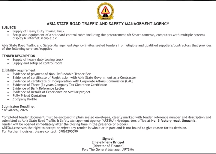 All bids are to be delivered to the agency’s headquarters located on Factory Road in Umuahia before the deadline scheduled for March 18, 2026.